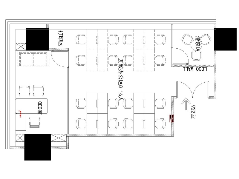 面积情况 102㎡、得房率约70%、可容纳8~12工位